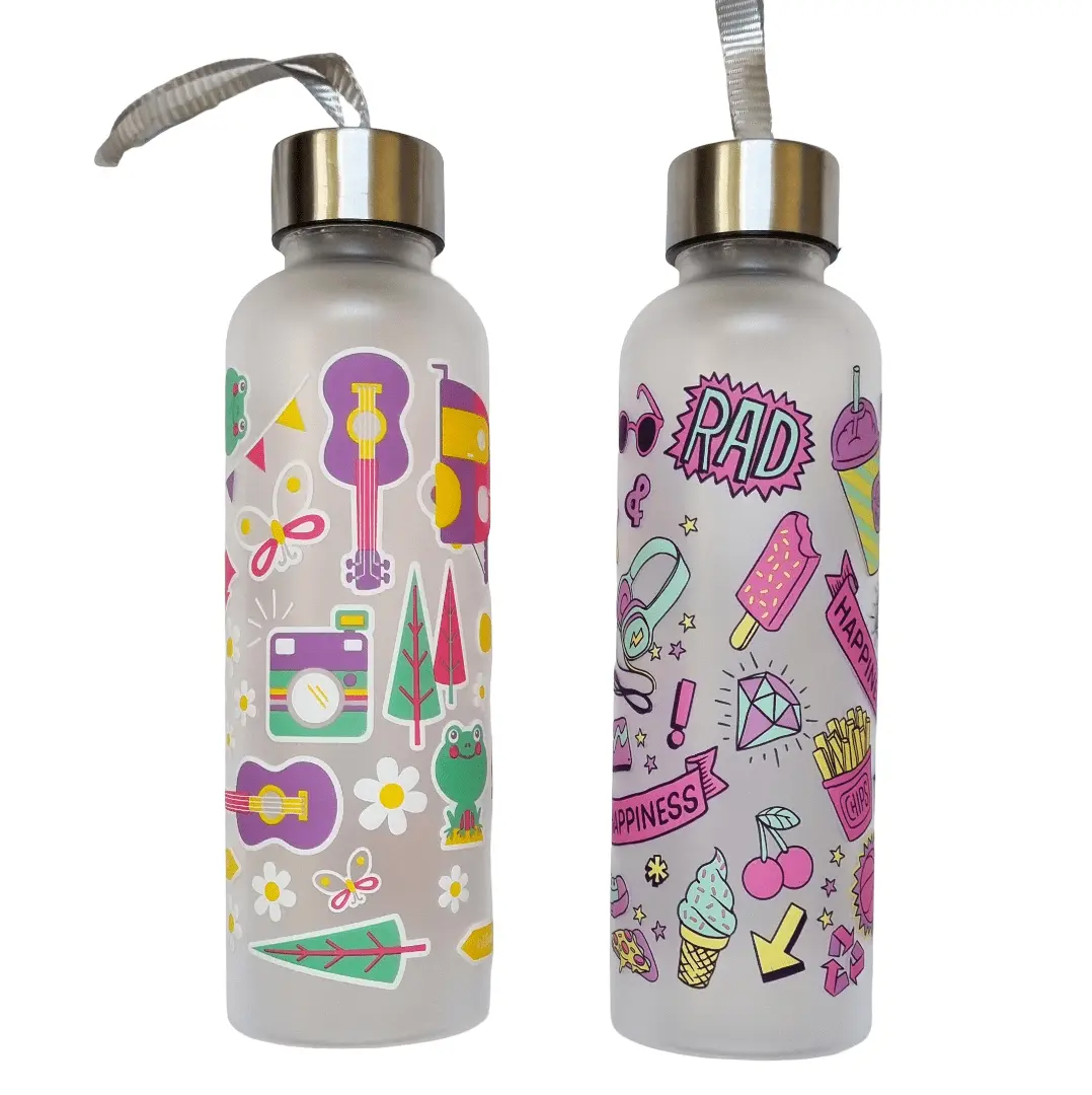 gourde en verre dépoli avec un bouchon en acier inoxydable et une dragonne en tissu. Elle est décorée de motifs estivaux colorés et de phrases telles que "JUST CHILL" et "COOL VIBES".