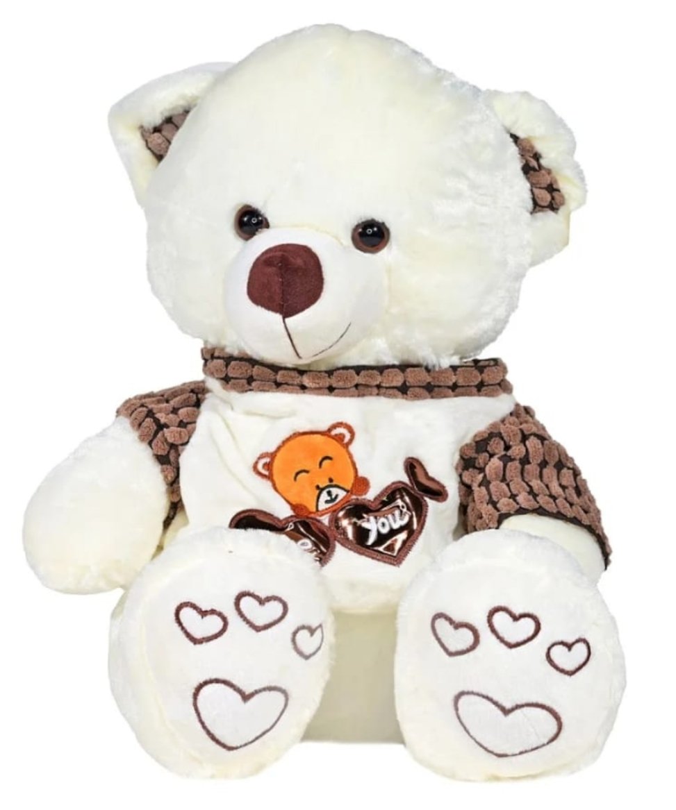 Design : L'ours porte un bavoir blanc avec des motifs en relief marron foncé sur les épaules.