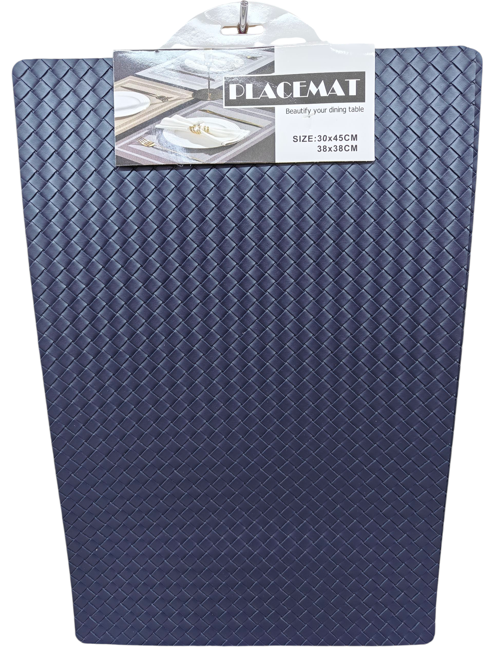 set de table (napperon) de couleur bleu marine avec un motif tressé. L'emballage indique qu'il s'agit d'un "PLACEMAT" et qu'il est destiné à "embellir votre table à manger".