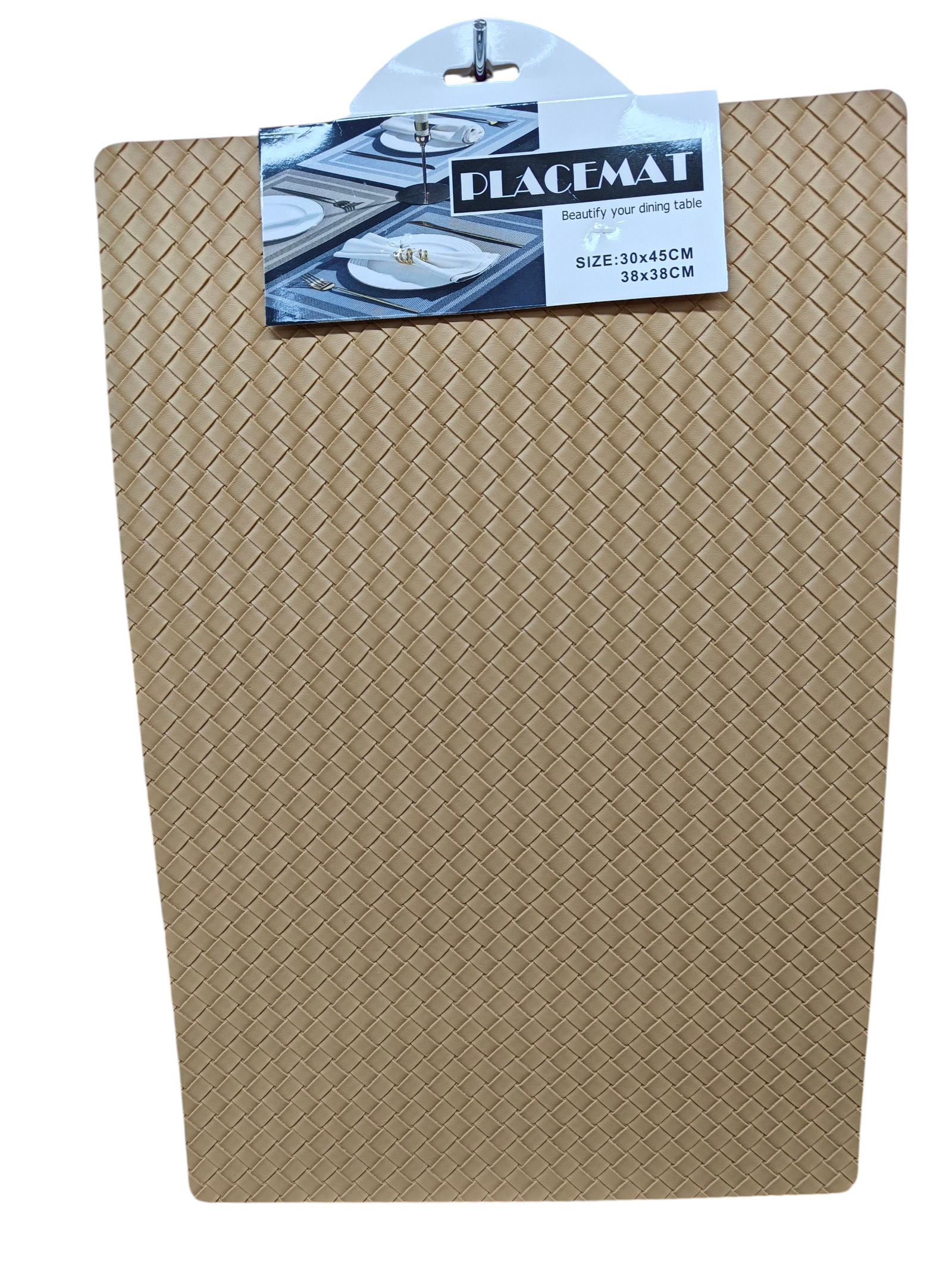set de table (napperon) de couleur camel 🐪 avec un motif tressé. L'emballage indique qu'il s'agit d'un "PLACEMAT" et qu'il est destiné à "embellir votre table à manger".   tailles  :30x45 cm